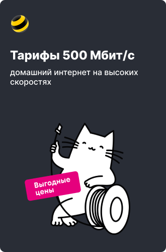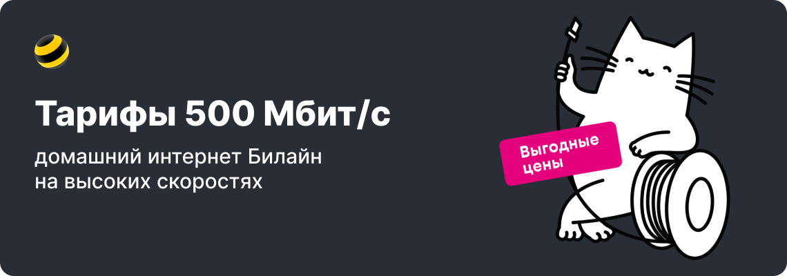 Билайн предоставляет несколько тарифных планов со скоростью интернета 500 Мбит/с. Все тарифы предлагаются с интернетом, а также цифровым ТВ. Этого хватает, чтобы играть онлайн, смотреть видео и скачивать крупные файлы.